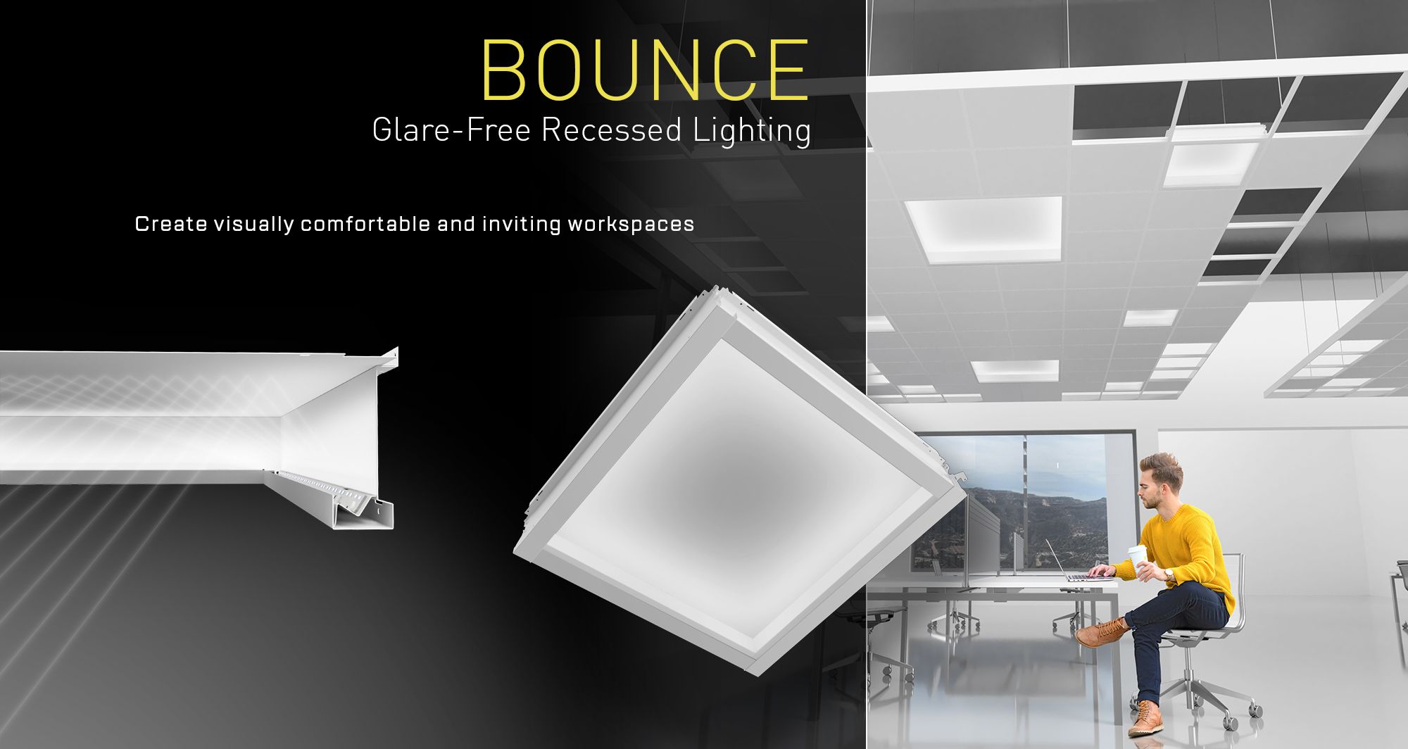 Bounce AE is a low glare recessed ambient lighting solution that brings softness and visual comfort to the modern workspace, letting your eyes rest so you can be comfortable and productive. Bounce AE is also the designer’s delight offering the ability to select the top reflector material. For the lowest cost and most practical version select a standard acoustical ceiling tile. If your choice is to get wild and creative…. Then you can pretty much select any material under the sun and turn the ceiling into an expression of light, color and texture.